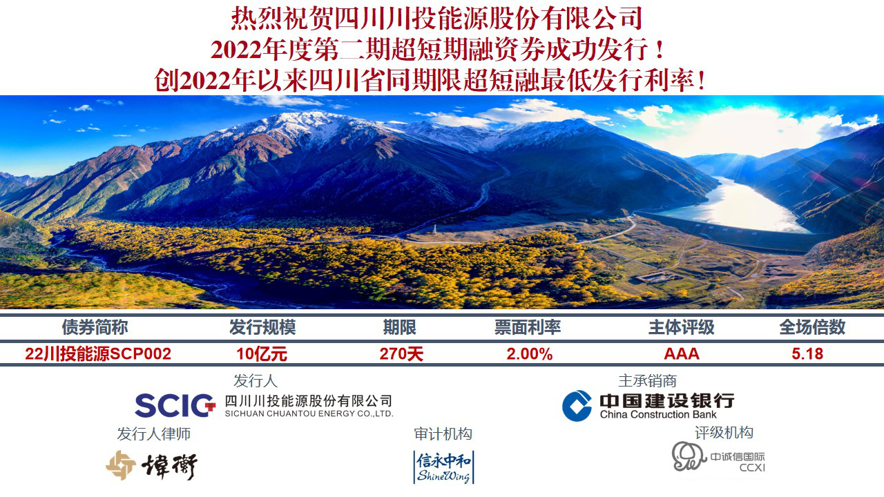 2022年8月3日,,,bm11222宝马娱乐网站能源乐成刊行2022年度第二期超短期融资债券,,,总金额10亿元,,,限期270天,,,利率2.0%,,,全场倍数5.18倍,,,创2020年以来四川省同限期超短融最低刊行利率。。。。