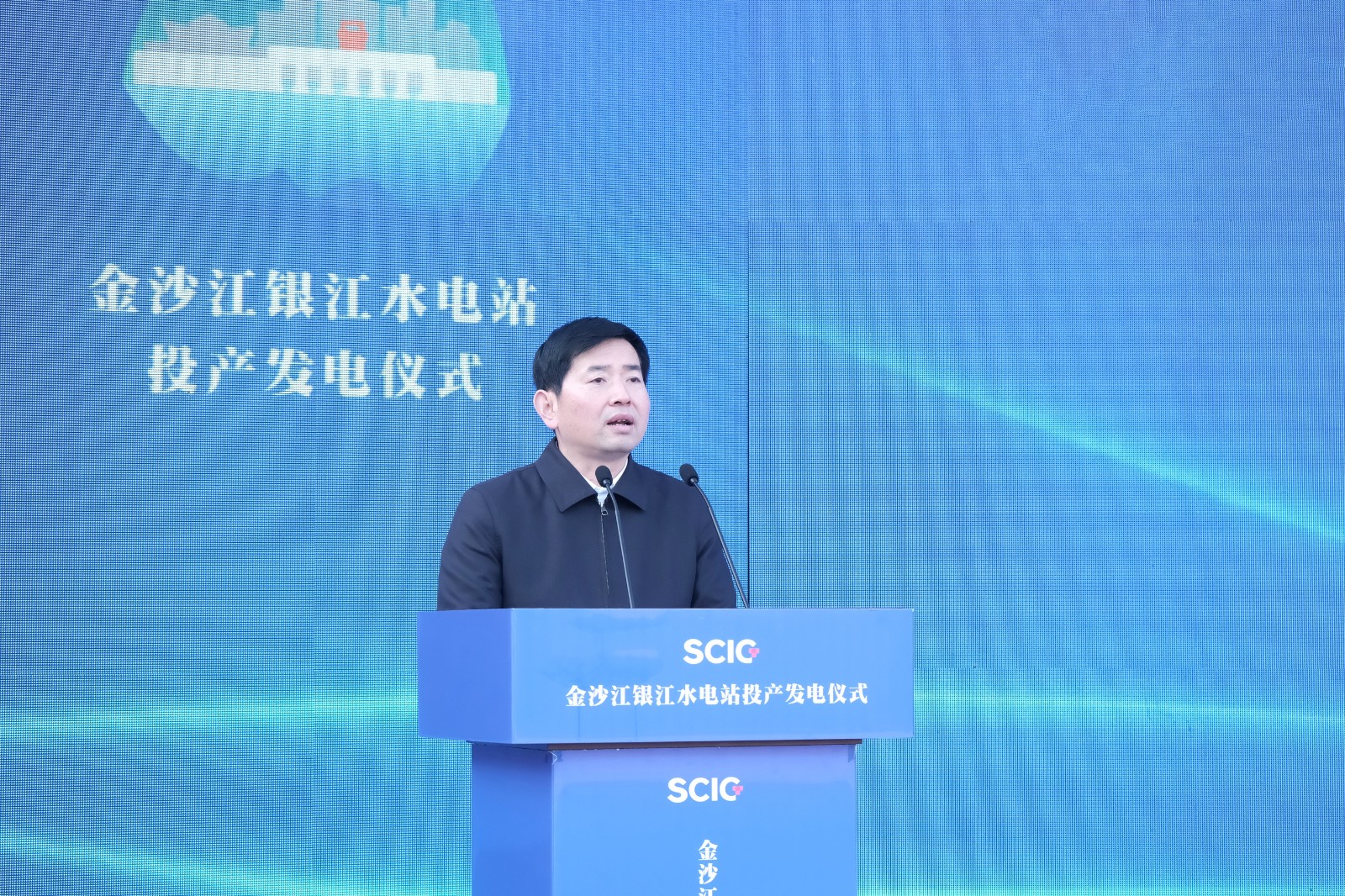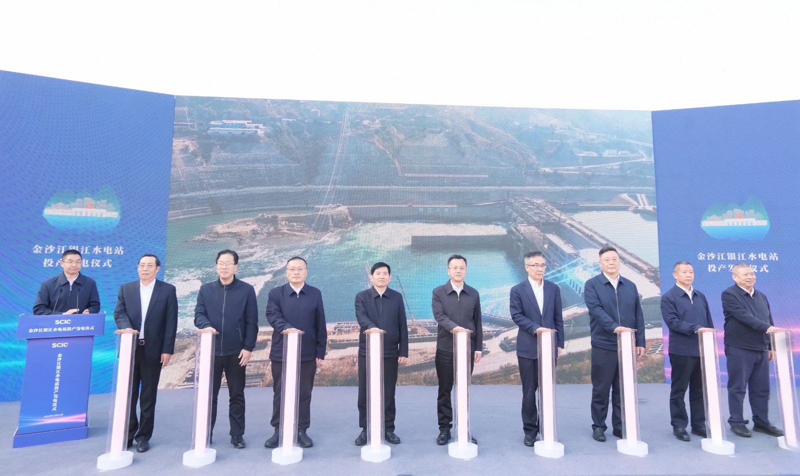 上午9时许,,,,,随着仪式现场下达首台机组开机发电指令,,,,,吴群刚、吴晓曦、范继跃、李文志、林开国、李仁杰等向导按下启动柱,,,,,配合启动金沙江银江水电站投产发电,,,,,标记着该水电站提前一年实现投产发电目的。。。。