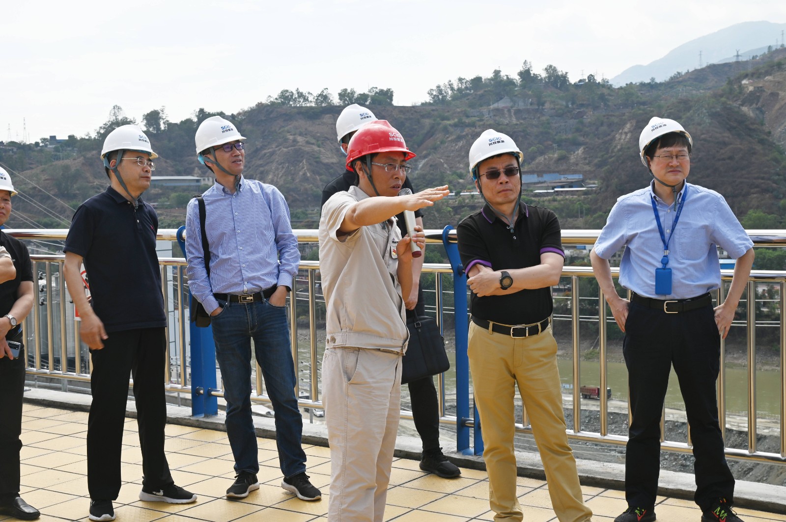 在银江水电站施工变电站观景平台,,,,孙前元一行听取了现在工程总体情形先容,,,,仔细审查康家沟渣场、导流明渠等部位工程形象面目及汛期值班值守事情等情形。。。。。