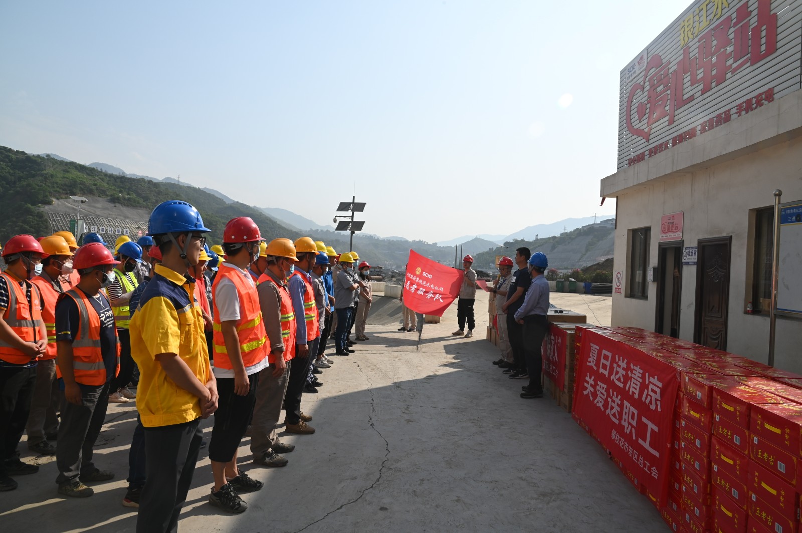 虽然是上午9点,,但盛夏的烈日已炙烤着银江水电站工地。。在银江水电站“爱心驿站”,,汪庆元首先致敬全体工友烈日下的“银江精神”,,高度赞扬了一线建设者三年来为银江水电站建设做出的起劲孝顺,,并勉励他们要战胜高温酷暑等重重难关,,坚守岗位完成工程建设使命。。刘欣在讲话中谈到:东区工会意系工友,,是各人的“外家人”,,希望各人珍重身体,,平安度夏,,在落实清静防护的条件下起劲事情,,保质保量推进项目施工,,为攀枝花的经济建设做出更大的孝顺。。