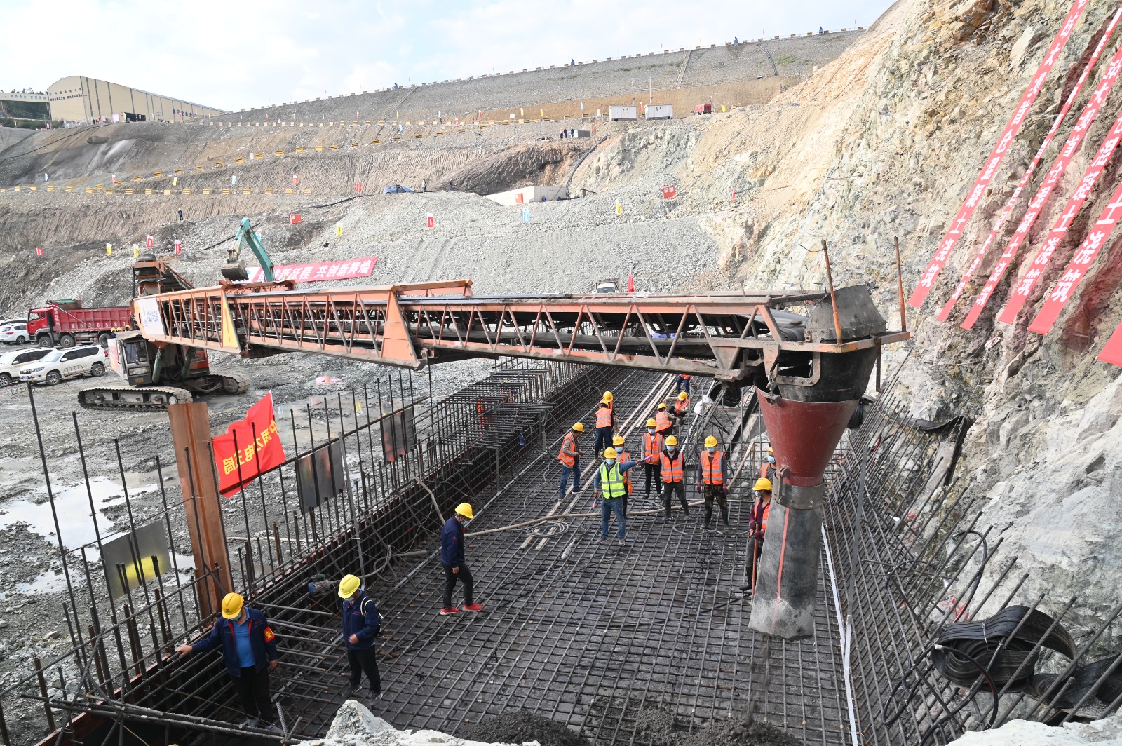 攀水电公司凭证工程建设现真相形,,,,于9月下旬实时制订了“决战四序度、大干一百天,,,,力争提前完成二期基坑开挖,,,,加速主体工程施工,,,,献礼二十大”运动实验计划,,,,建设了指挥部、6个工程推进组和7个运动包管组,,,,组织召开了启动会。。。。。在运动开展历程中,,,,攀水电公司主要治理职员团结向导各参建单位,,,,逐日召开生产协调会,,,,党员干部深入一线,,,,实时解决现场问题,,,,统筹组织施人为源,,,,逐日24小时不中止举行二期基坑开挖,,,,阻止现在二期基坑即将开挖完成,,,,装置场、1#~4#机组段、厂坝导墙及消力池等部位已最先混凝土浇筑,,,,较条约妄想12月浇筑大坝首仓混凝土的目的提前了30天。。。。。