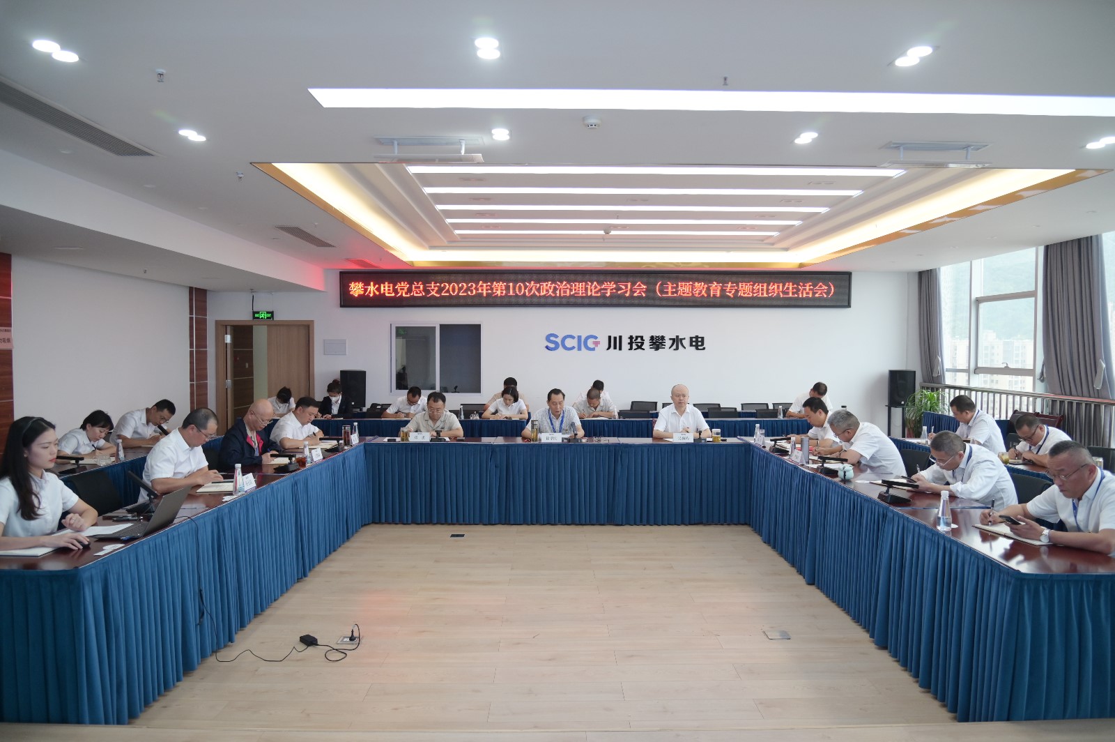 为打牢开好主题教育专题组织生涯会的头脑基础,,,,,进一步统一头脑、深化熟悉,,,,,8月27日上午,,,,,攀水电党总支召开2023年第10次政治理论学习(扩大)聚会,,,,,专题学习贯彻习近平新时代中国特色社会主义头脑主题教育组织生涯会。。。公司党总支书记、董事长徐孝刚主持聚会并举行了钻研讲话。。。党总支政治理论学习会成员、全体党员、非党干部、入党起劲分子共40余人加入学习。。。
