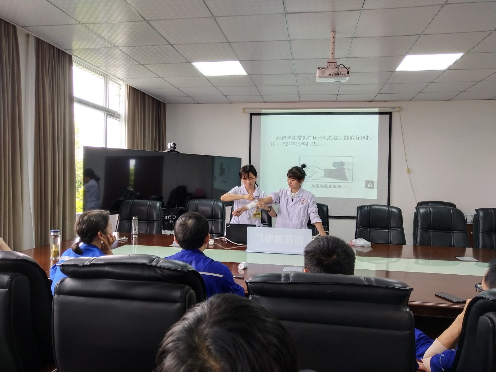 培训先生连系多年的临床履历及电站事情特点,,,,通过播放幻灯片和视频、展示实物、现场演示等形式,,,,以近年来爆发在身边的鲜活事例,,,,向学员们强调了应抢救护“黄金四分钟”的主要性,,,,随后逐一解说了胸外按压、人工呼吸、止血、包扎、骨折牢靠、伤员搬运等抢救理论与施救技巧,,,,并现场实操心肺苏醒、绷带、三角巾包扎等要领,,,,教会工人遇到意外危险时怎样就地取材举行起源应急处置惩罚,,,,同时还与电站员工现场互动,,,,手把手的教授相关操作手艺,,,,以确保学员能够充分掌握并准确运用。。。